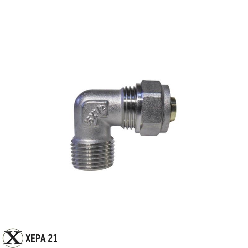 Мъжкото коляно Ф20 х 3/4" е разглобяем компресионен фитинг, който е от ключово значение при изграждане на главни захранващи линии за отопление и водопровод. Той позволява на тръба с диаметър 20 мм да направи рязък завой под прав ъгъл и да се свърже директно към 3/4" женска резба, спестявайки нуждата от допълнителни адаптори и колена.