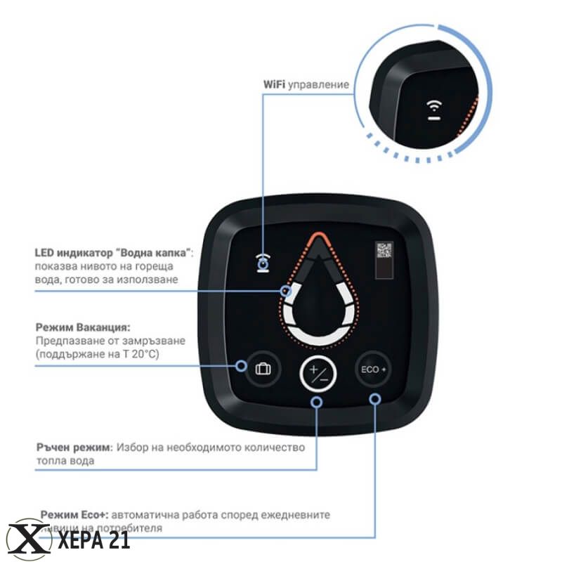 - Режим ECO+: Автоматично регулиране на работата на бойлера в зависимост от навиците на потребителя за допълнителна икономия на енергия.