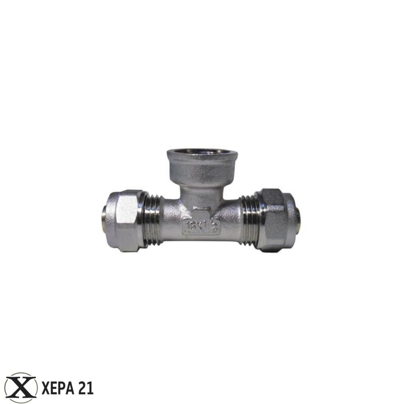 Женският тройник Ф20 х 1/2" х Ф20 е основен елемент за създаване на функционални разклонения. Изработен от никелиран месинг, той позволява преминаването на тръба Ф20, като същевременно предоставя 1/2" вътрешна резба за лесно и надеждно присъединяване на спирателни кранове, обезвъздушители или други компоненти с мъжка резба.